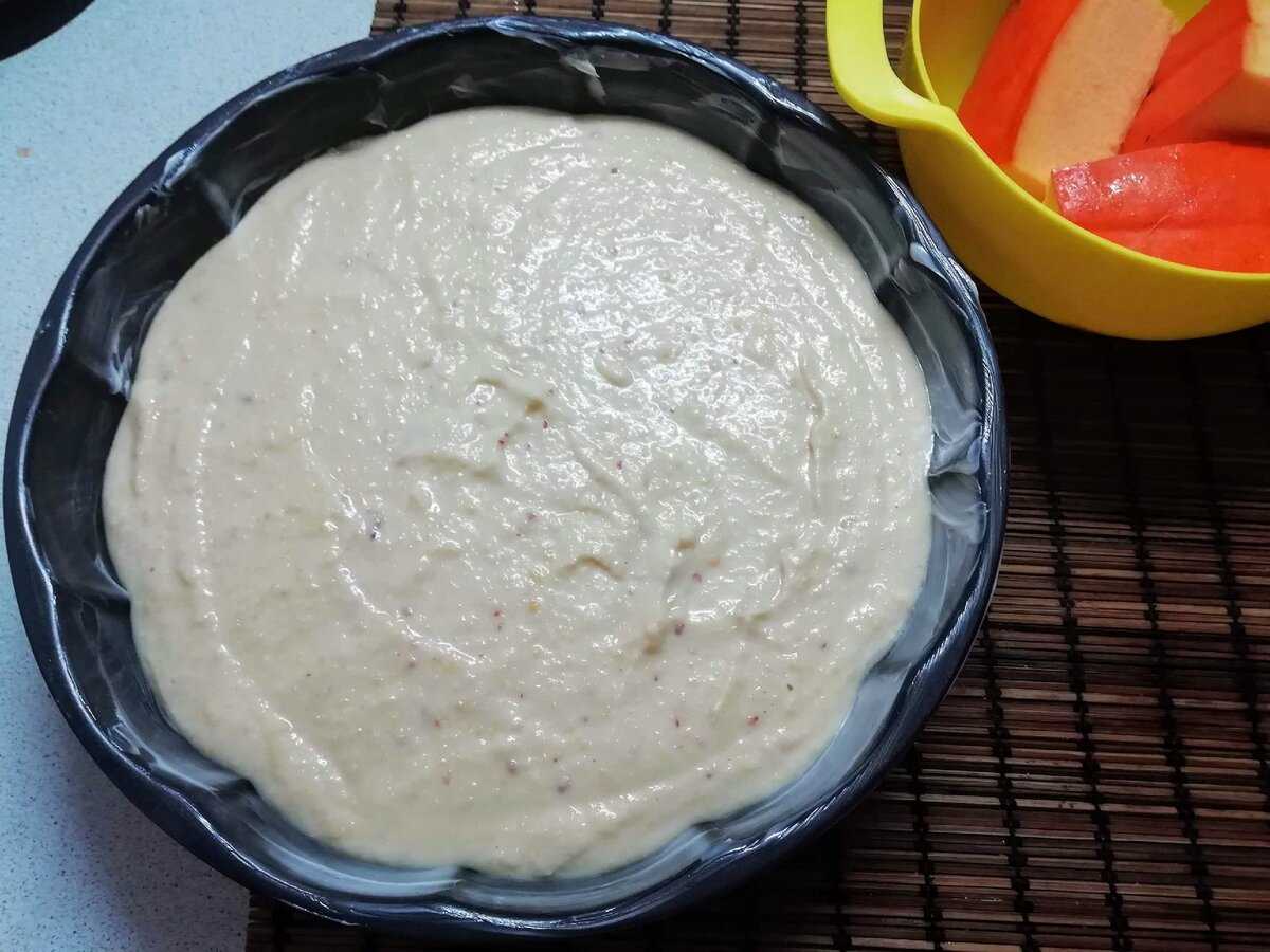 - Форму для выпечки тщательно промазать маслом и насыпать будущий пирог слоями. Сначала мучную смесь, затем яблочно-тыквенную и так далее. Сверху должен оказаться сухой слой.