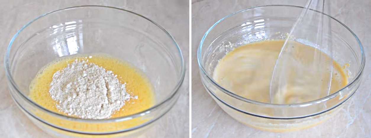 - Жидкость слегка прогреть, добавить часть пшеничной муки, размешать, добавить часть овсяной муки, соду.
