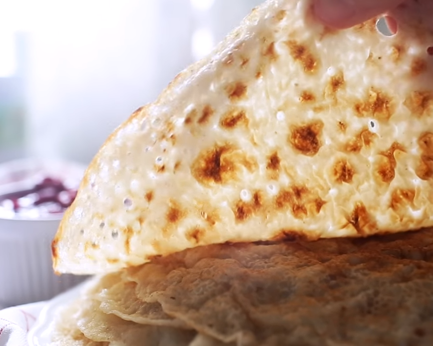 Несмотря на то, что в тесте нет разрыхлителя, и оно не слишком жидкое, блин все равно получается с дырочками. Пекутся блины очень быстро, около 1 минуты с каждой стороны. Сами блинчики получаются мягкими.