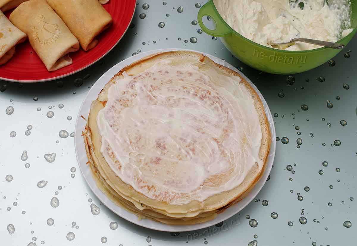 13. Теперь можно приступать к фаршированию блинов. У меня из данного количества ингредиентов получилось 27 маленьких блинчиков диаметром 16 см, и я решила накрутить из них небольшие трубочки. Если у вас была сковорода большого диаметра, то удобнее будет свернуть из блинов конвертики.