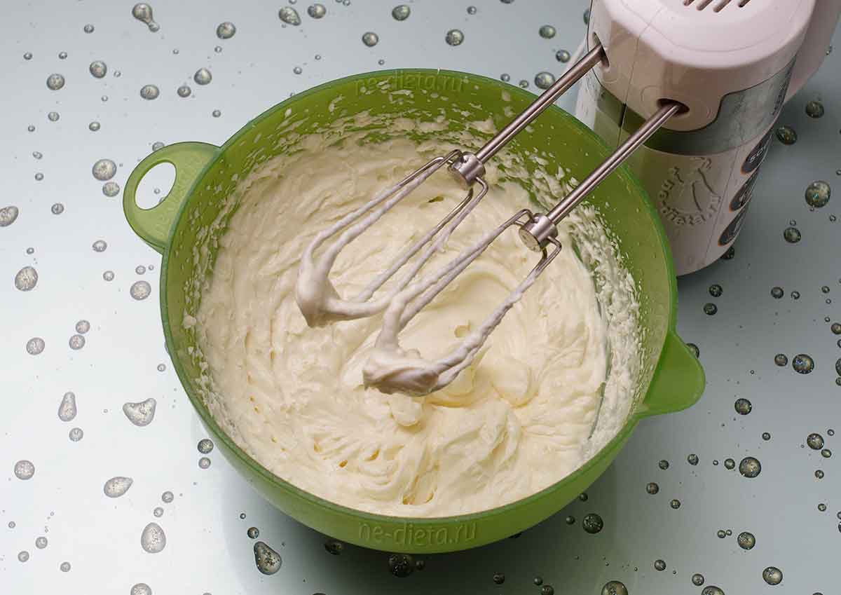 4. В 2 захода всыпать в тесто просеянную муку и тщательно перемешать миксером, чтобы не было комочков.