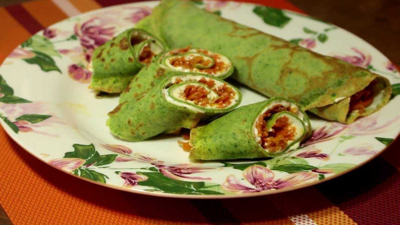 - Смазать блинчики начинкой и свернуть их рулетом. Края закуски обрезать острым ножом.