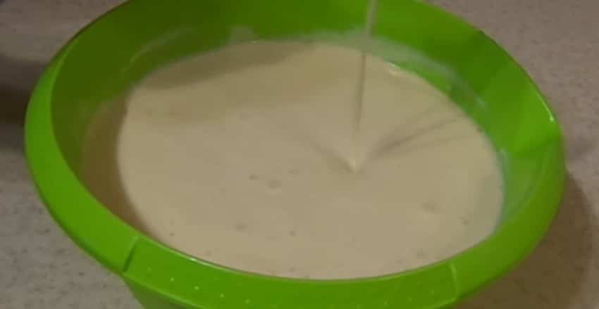 4. Соединить продукты и тщательно взбить с помощью миксера или обычного венчика. Тесто должно напоминать жидкую сметану. Если же получится чуть гуще, то лучше добавить немного воды.