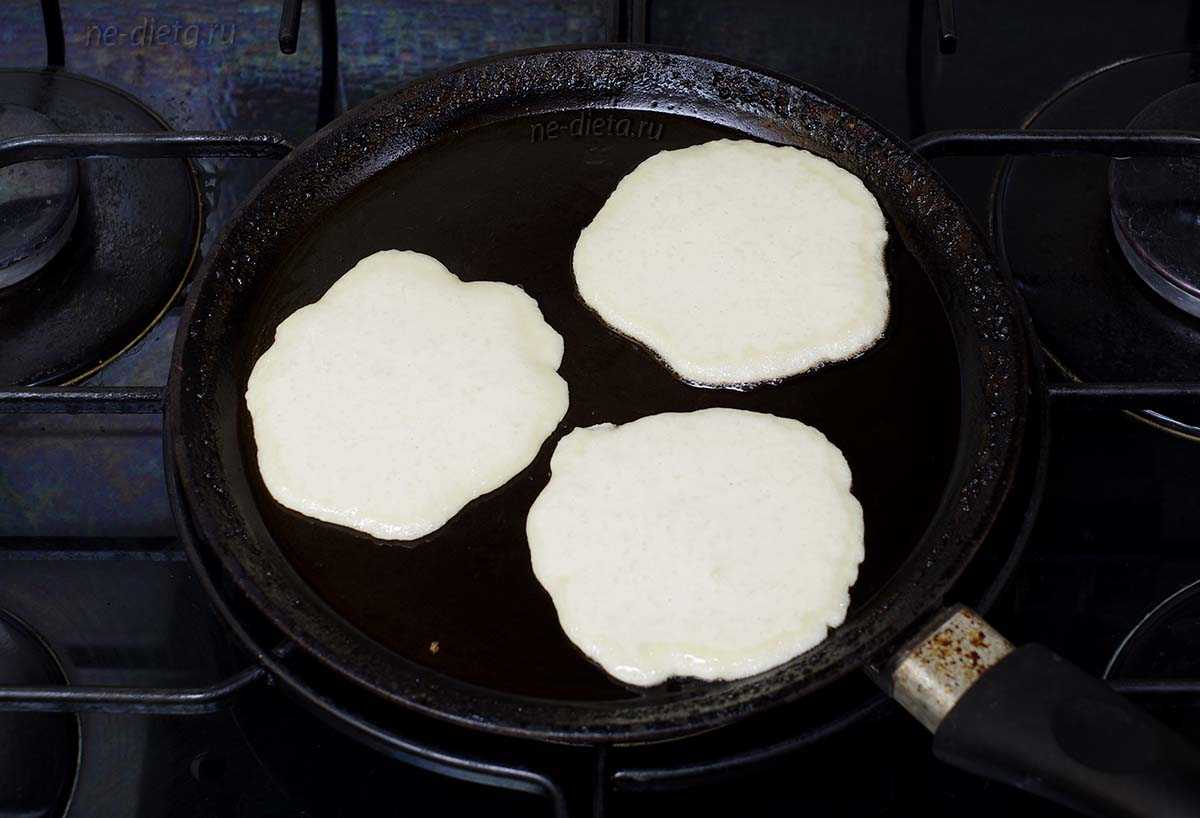- Ложкой выкладываем тесто на сковородку и формируем блинчики. Жарим с обеих сторон.