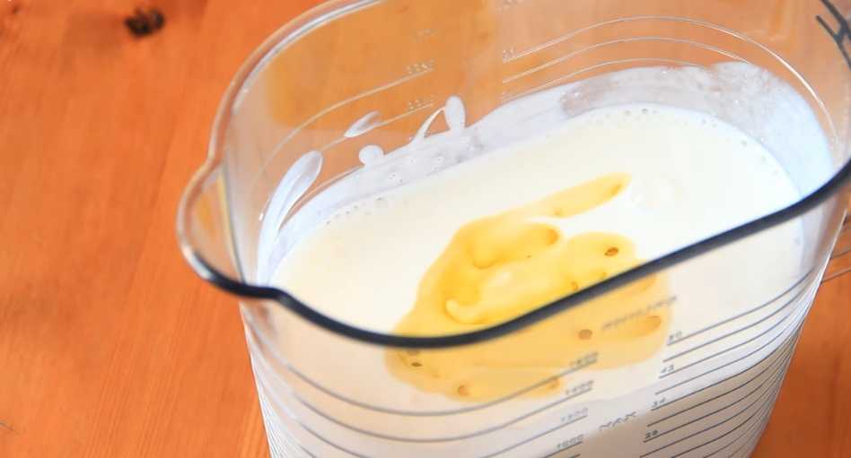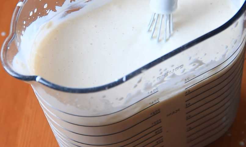Поэтому вливать нужно тонкой струей, постоянно помешивая. Тесто должно вспениться.