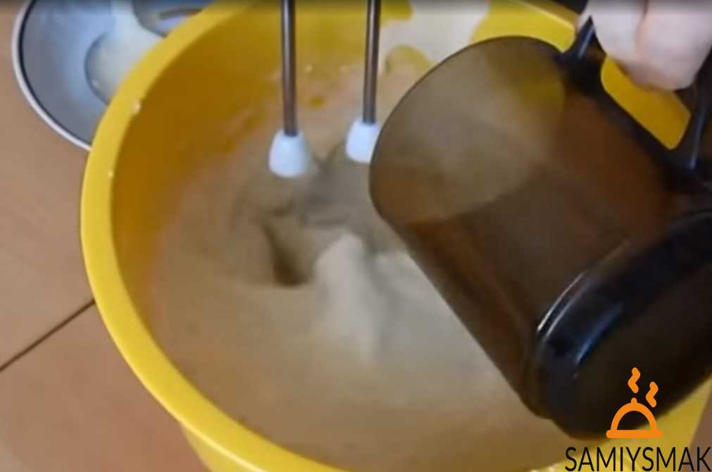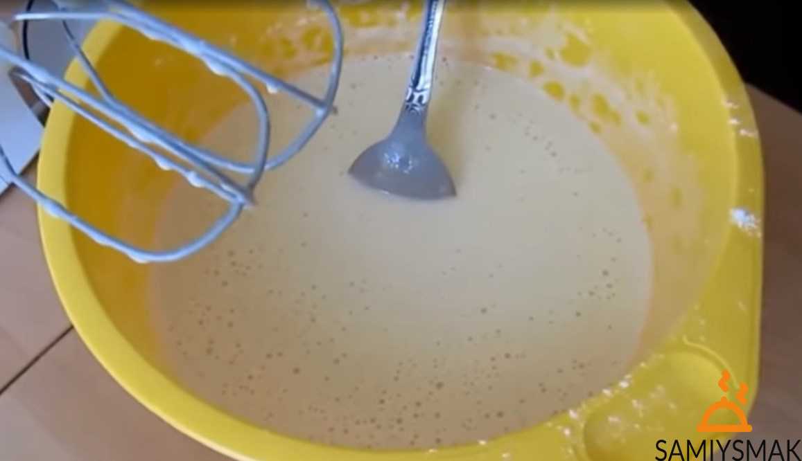 - Вливаем в смесь кефир и продолжаем размешивать.