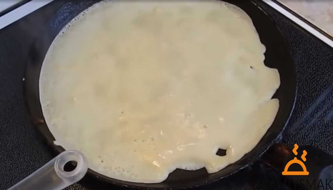 - Разогреваем сковороду и вливаем в нее немного жидкого теста.