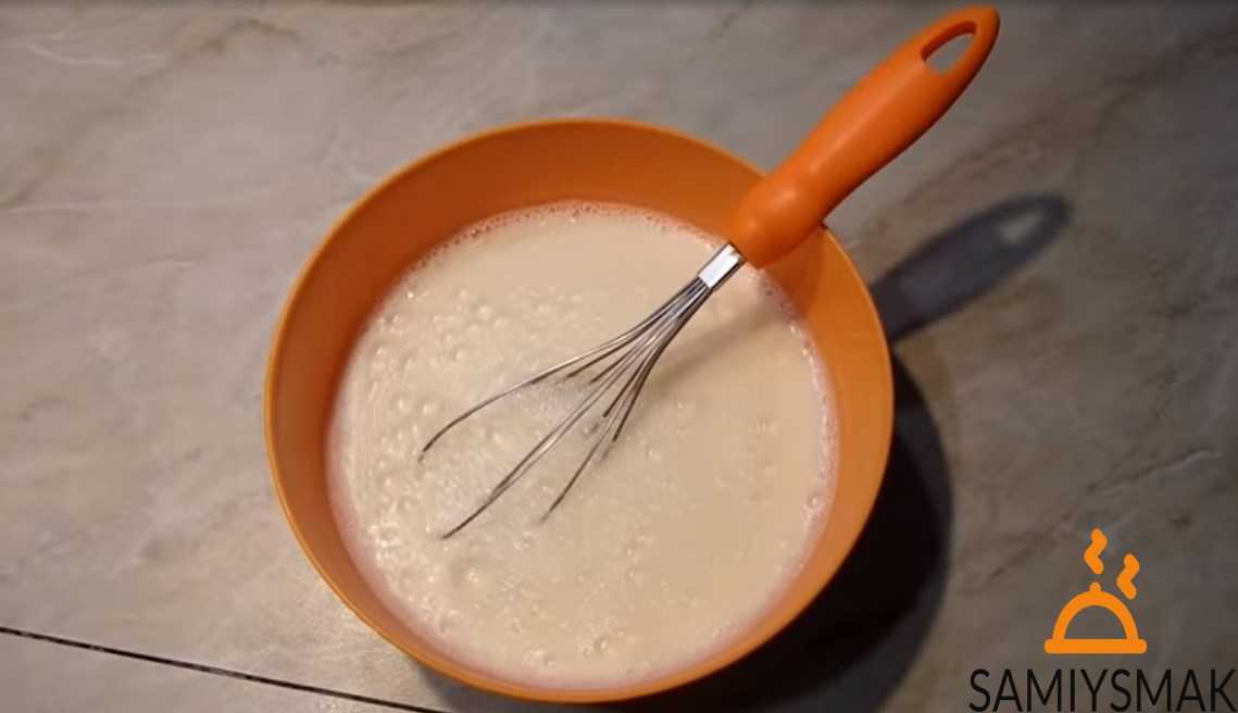 - В глубокой емкости миксером взбивают молоко с яйцами.