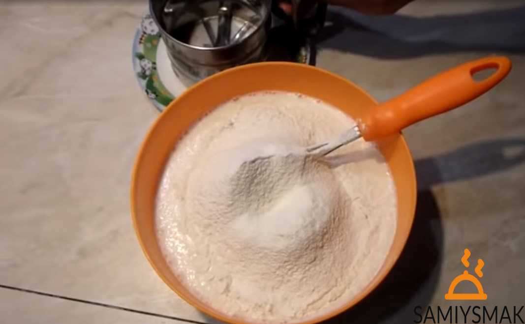 2. Замешиваем тесто. Муку делим на 2 половины. Сначала просеиваем в чашу первую половину и венчиком размешиваем до гладкой консистенции. Потом просеиваем вторую половину и также хорошо размешиваем, чтобы не осталось комочков.
