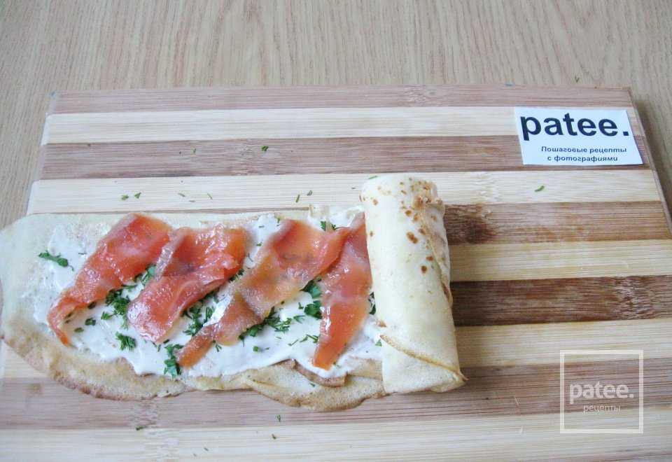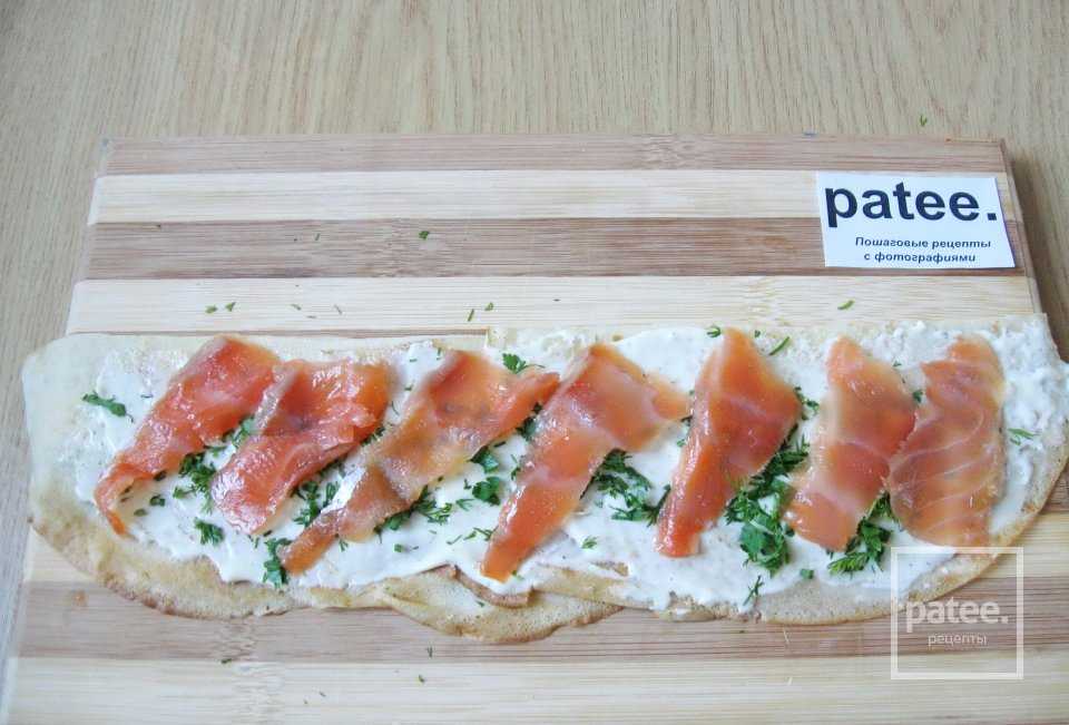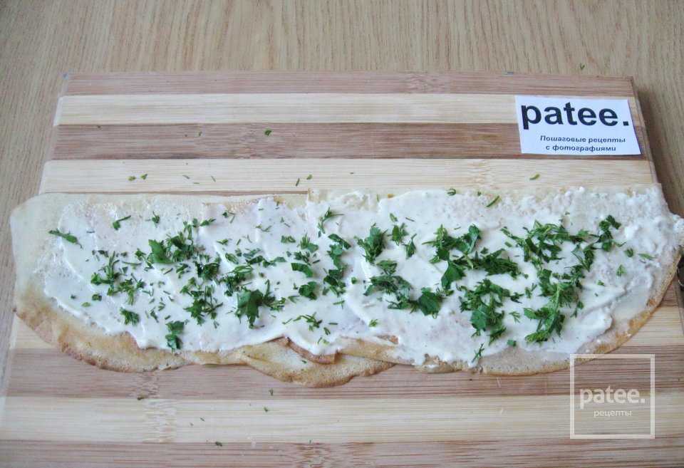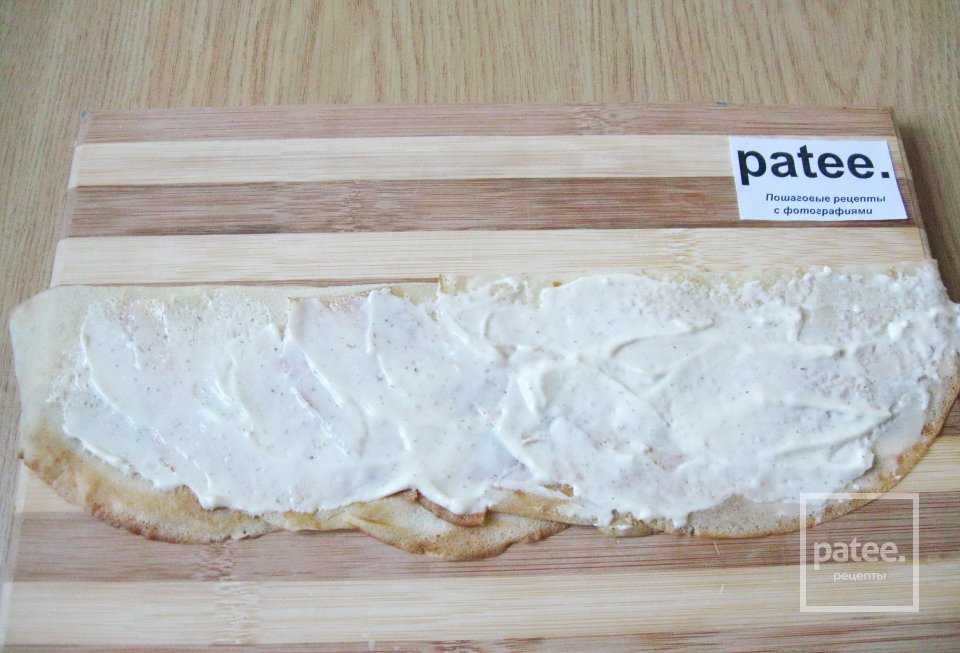 Смазываем половинки блинов сливочным сыром.