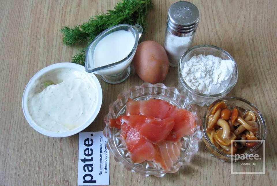 Для приготовления блинных пенёчков нужно взять такие продукты: молоко, яйца, муку, соль, сахар, солёную форель(сёмгу, лосось, горбушу), маринованные опята, сливочный сыр и зелень.