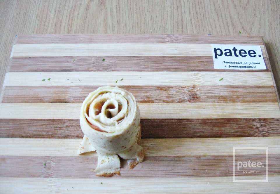 Сворачиваем половинки блинчиков с начинкой рулетом.