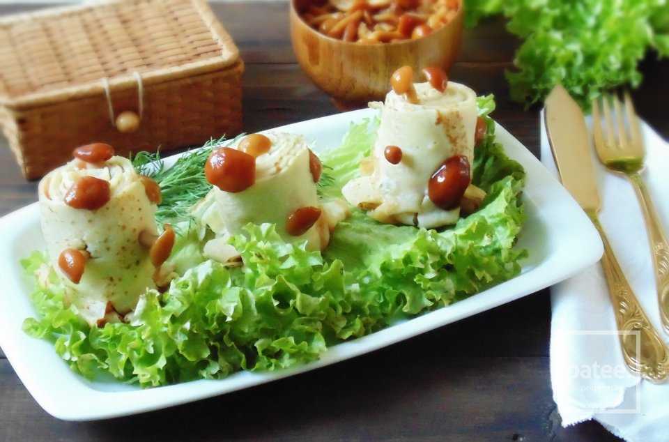 Блинные “пенёчки” — это холодная закуска, отличная на вкус и оригинальная по виду. Когда блины во всех известных вам вариантах уже надоели, приготовьте вот такой. Все очень просто. Печете тонкие блинчики по стандартному рецепту. Каждый блин разрезаете пополам и выкладываете четыре половинки внахлёст. Смазываете сливочным сыром или мягким плавленым, выкладываете кусочки солёной красной рыбы и сворачиваете блинчики рулетом. Украшаете “пенёчки” маленькими маринованными опятами. Чудесная закуска к праздничному столу готова.
