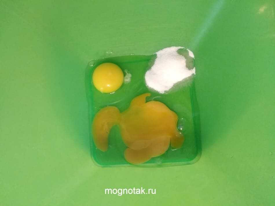Воспользовавшись ножом, разбиваем скорлупу яиц, а желтки с белками выливаем в маленькую миску. С помощью миксера или ручного венчика взбиваем компоненты до образования однородной желтой массы