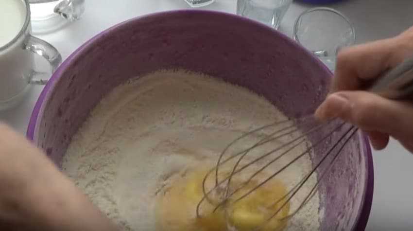 Далее смесь потребуется взбить венчиком или вилкой. После – добавить половину молока (1 ст.).