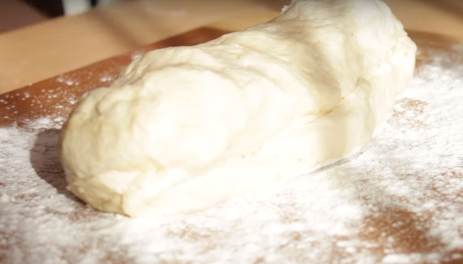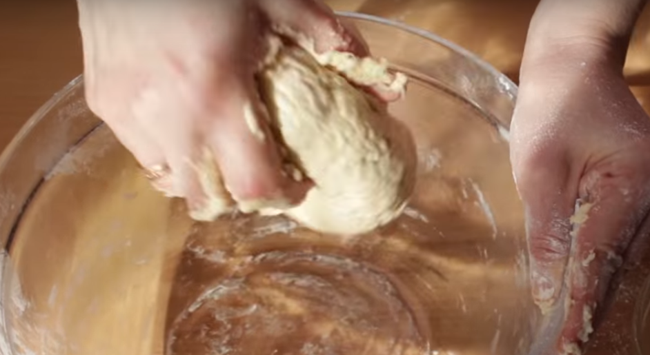 - Хорошо руками вымешивайте тесто, смазав их маслом (то же можно проделать и с рабочей поверхностью).