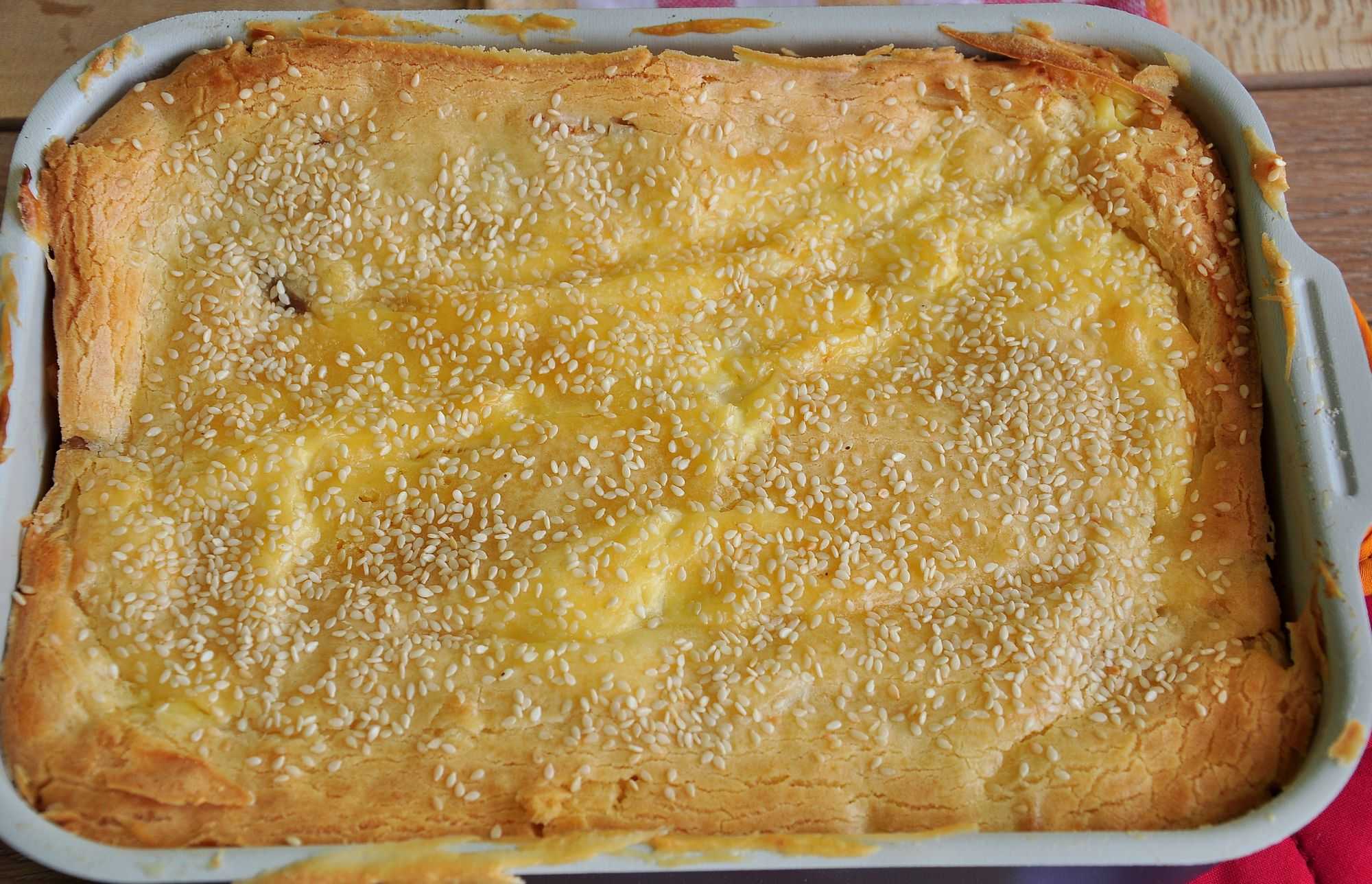 Форму для выпечки смажьте внутри маслом. Посыпьте панировочными сухарями. На дно вылейте половину готового теста. Сверху равномерно распределите яичную начинку. Залейте остальным тестом и выровняйте поверхность. Желток, который остался – смешайте с ложкой сметаны. С помощью силиконовой кисточки покройте верхнюю часть пирога. По желанию посыпьте семенами кунжута. Поставьте выпекаться в духовку. Регулятор температуры устанавливайте на 180 градусов – как обычно требуется для выпечки. Засеките 70 минут.