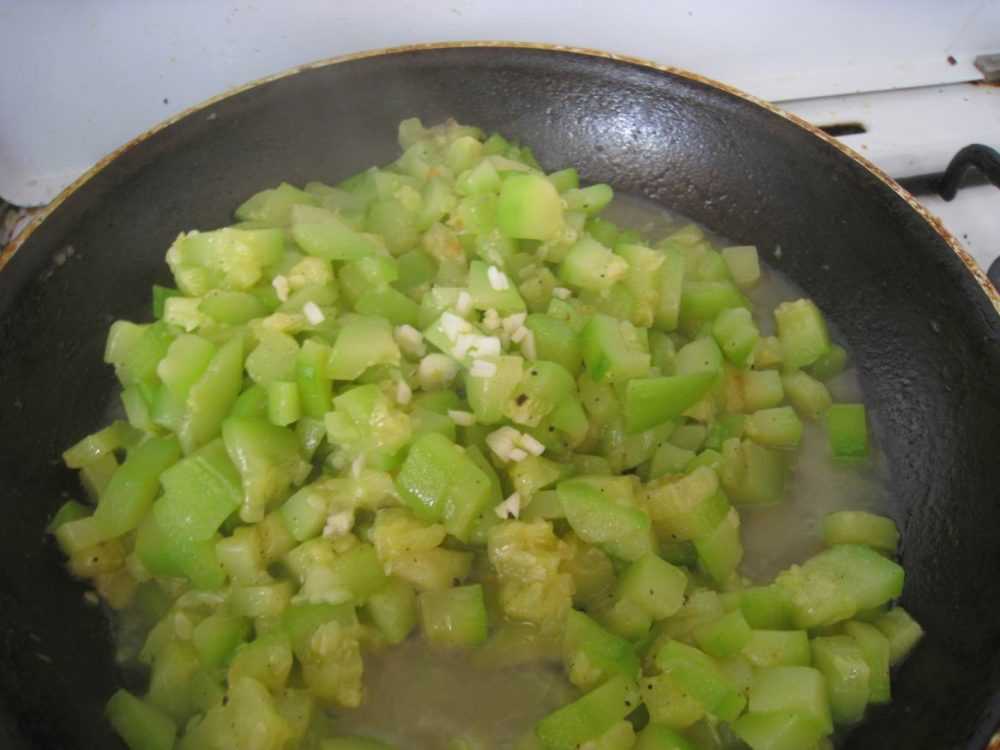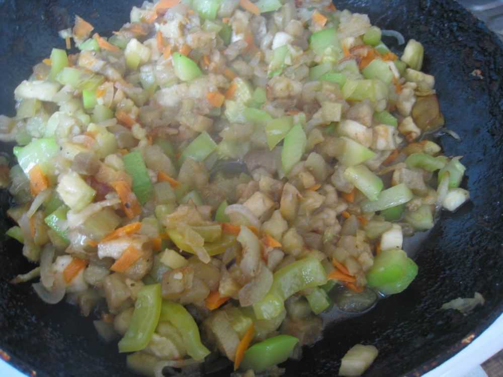 Обжариваем отдельно баклажаны, лук и морковку до полуготовности. Также обжариваем кабачки, добавив пару долек чеснока. Если много жидкости, сливаем ее — она нам не понадобится.