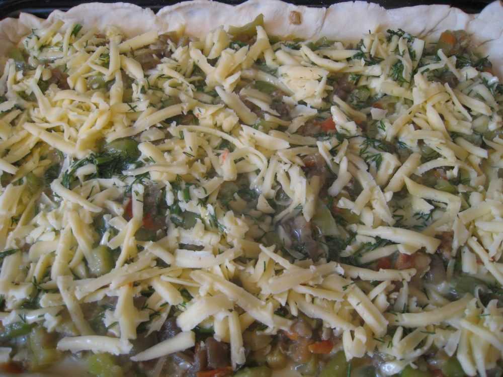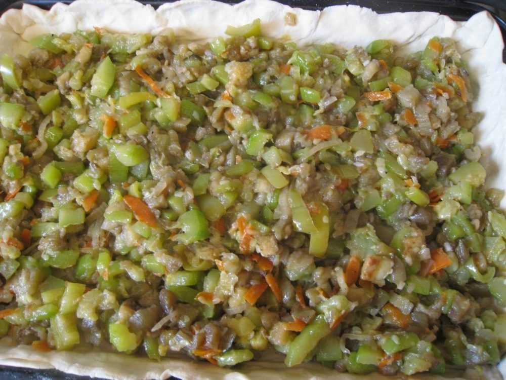 Остужаем овощную смесь. Тем временем, пока смесь остывает, выкладываем слоеное тесто на противень с высокими бортиками (можно использовать два пласта, чтобы пирог был не такой мокрый и не протек). Накалываю чуть и выкладываю на тесто остывшую начинку.