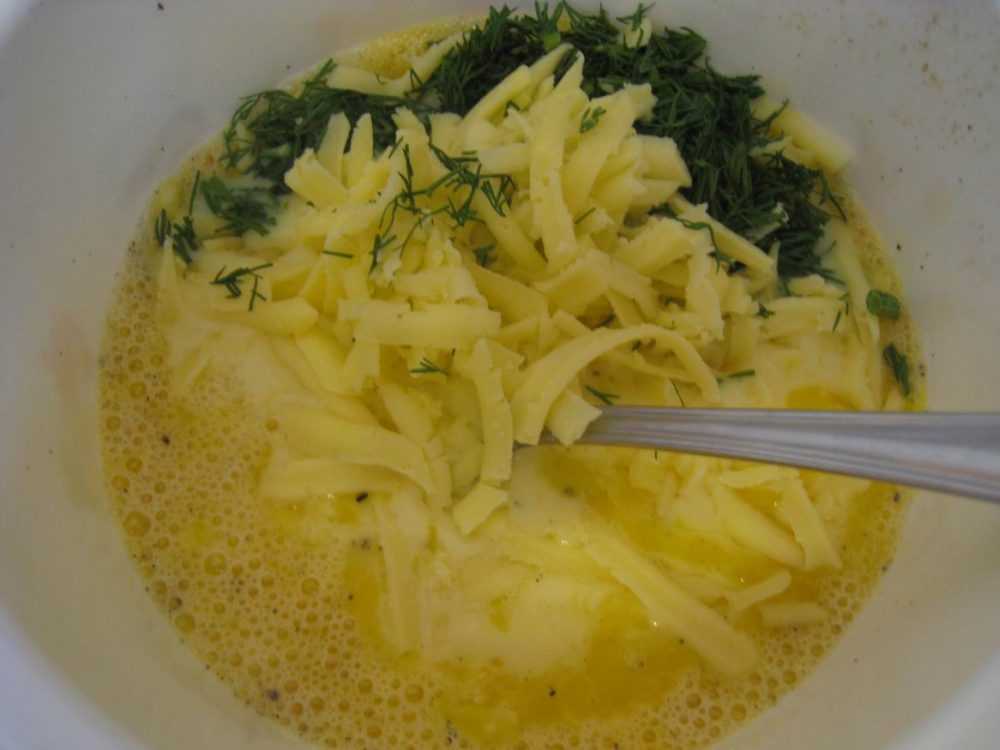 Три яйца, ½ — 1 стакан молока или сливок смешиваем, солим, перчим, добавляем зелень и натертый сыр. Тут не требуется какого-то взбивания, просто хорошо перемешиваем.
