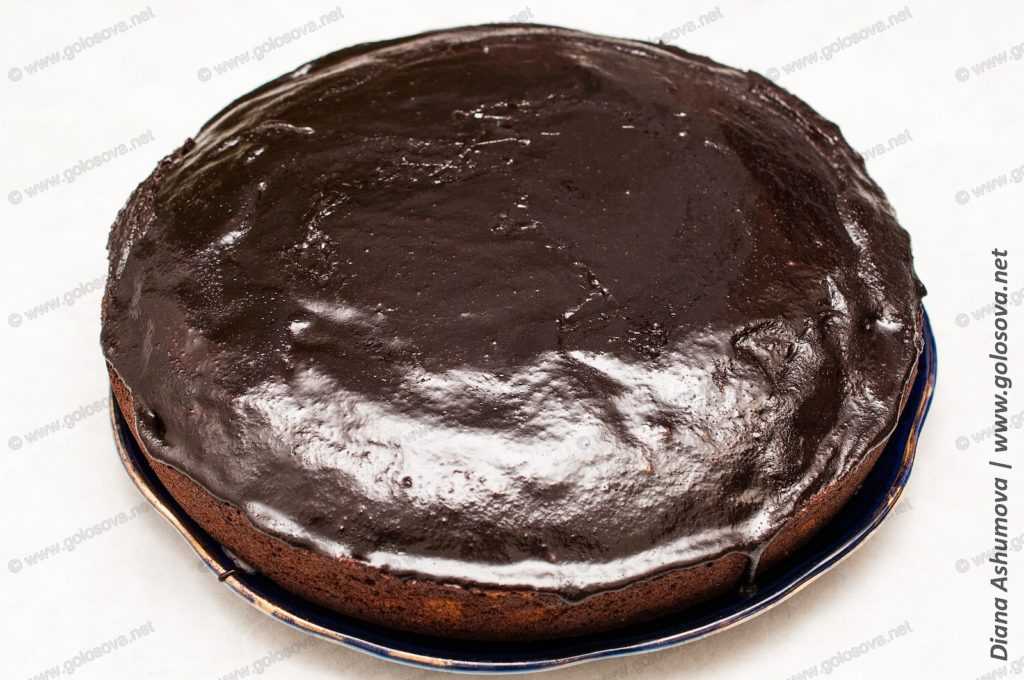 - Смазываем коржи из кекса кремом и заливаем сверху глазурью.