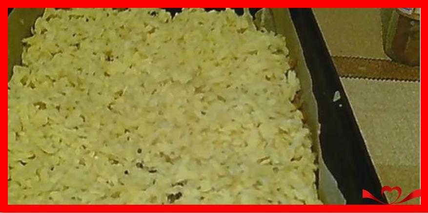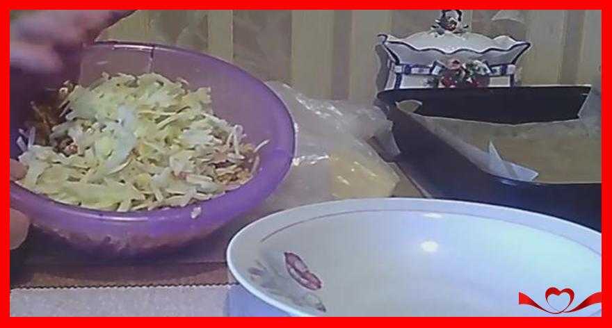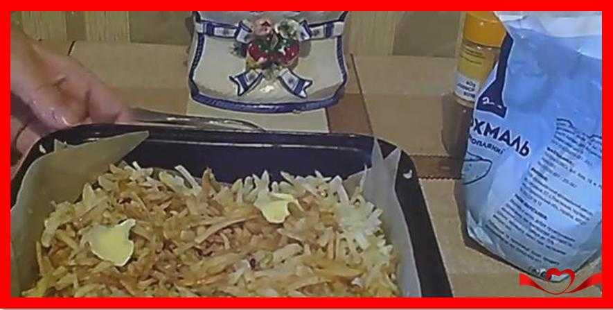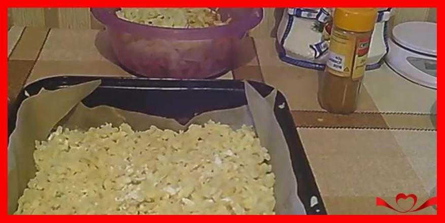 - Начинку закрывают тестом, которое после заморозки натирают на крупной терке. Изделие выпекают в горячей духовке до золотистой корочки порядка получаса.