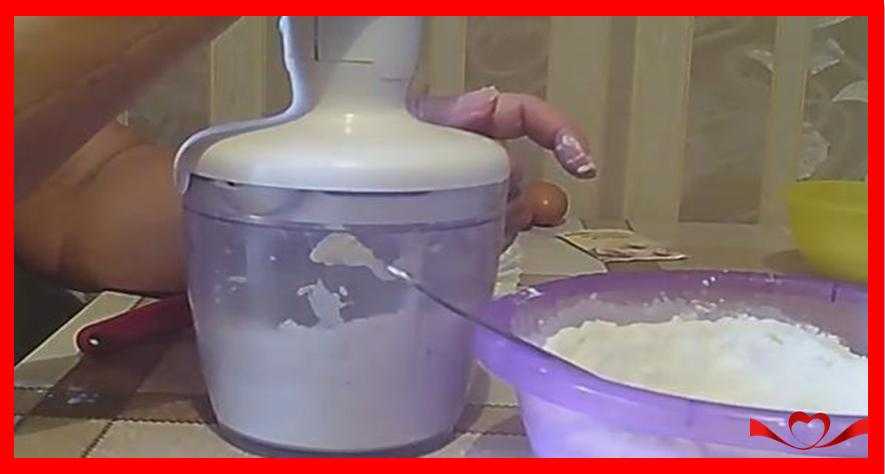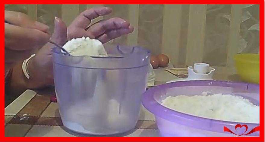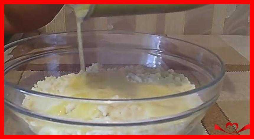 - В это время можно приготовить творожную начинку. Тщательно взбиваем творог, куриные яйца и сахар. Должна выйти пышная масса.