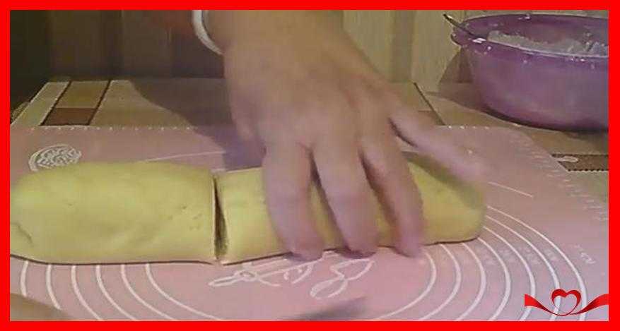 - Из полученного теста отделяем небольшой кусок и кладем его в морозильную камеру. Остальной продукт тонко раскатываем и располагаем на противне.