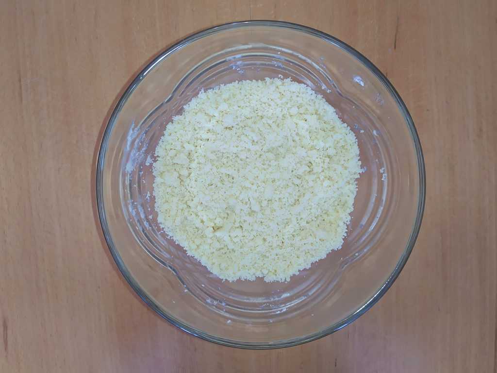 Если вы хотите получить изделие с более плотной песочной основой, то тесто будет тертым. Его вымешивают и после активного охлаждения натирают на терке, образуя крошку. Крошку используют для низа пирога и для верха, если пирог закрытый. Для такого теста потребуется: