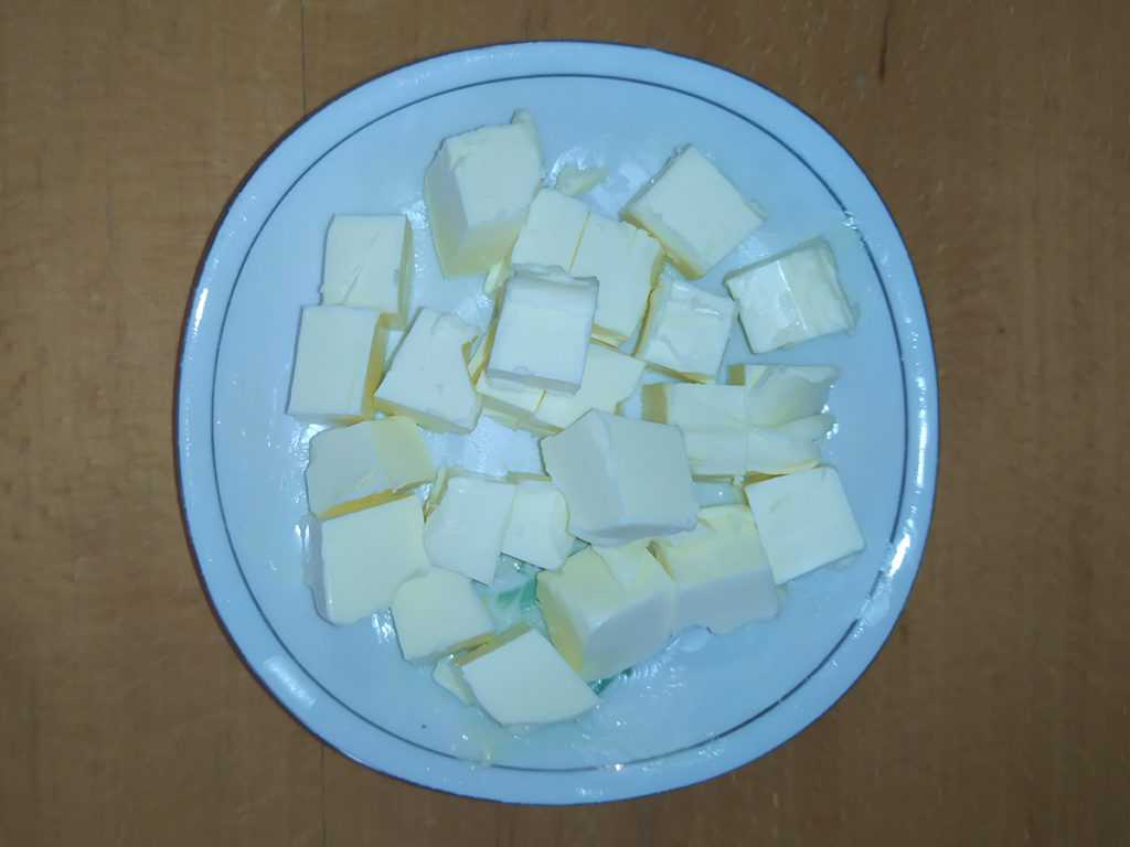 Шаг 2. Масло сливочное достаем из холодильника, нарезаем на небольшие кубики и оставляем, чтобы оно размягчилось на 30 минут.