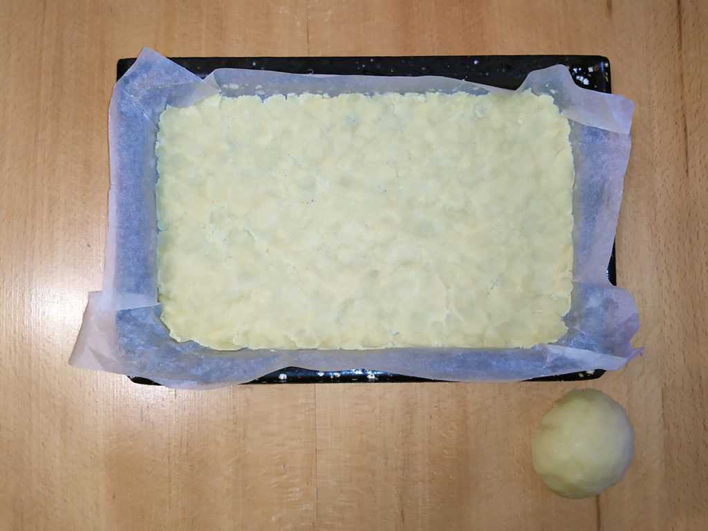 - Для песочного коржа нужно замесить тесто, смешав 200 г сливочного масла кремоподобной консистенции с 360 г муки, солью и содой до состояния масляной крошки. Затем вбить в нее одно яйцо, собрать всю мягкую массу, которая не будет крошиться, и липнуть к рукам. Равномерно распределить песочное тесто по противню и можно приступать к следующему слою.