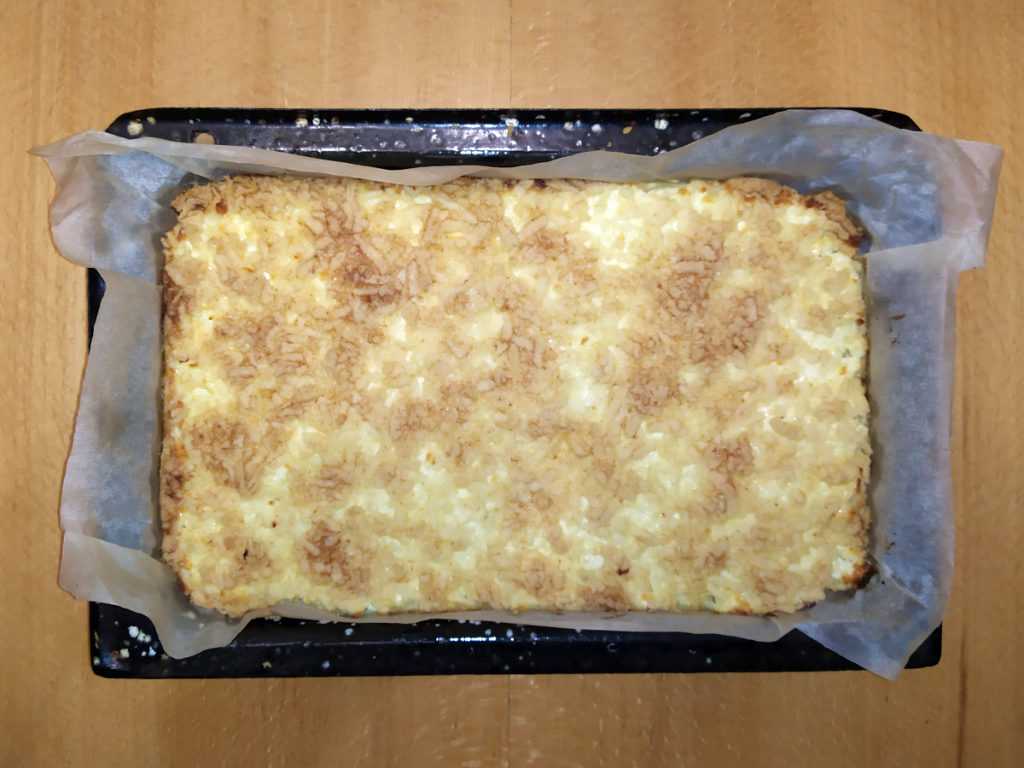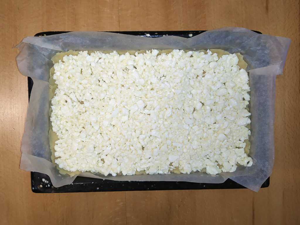 Шаг 4. Достаем из морозилки маленький кусочек теста и натираем его на крупной терке сверху на творог. Также раскидываем ровным слоем.