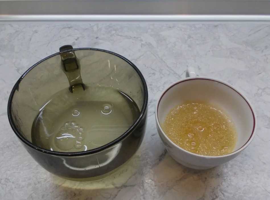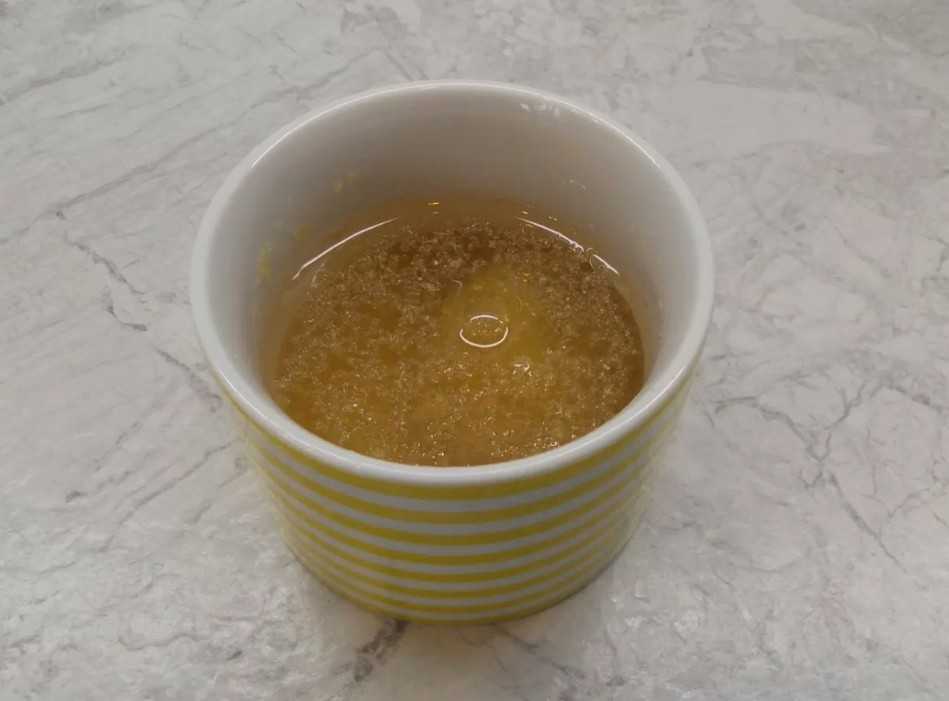 - Набухший желатин подогреваем на водяной бане или микроволновке для растворения гранул. Выливаем в персиковый компот и перемешиваем.