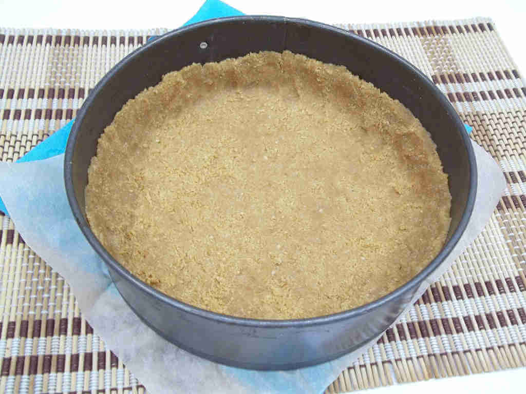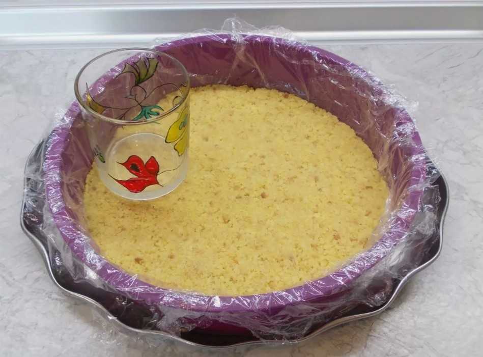 Круглую форму застелите пищевой пленкой. На дно формы выложите песочную заготовку и сформируйте из нее корж-основу, хорошо утрамбуйте его. Поставьте форму с коржом в холодильник на 30 минут.