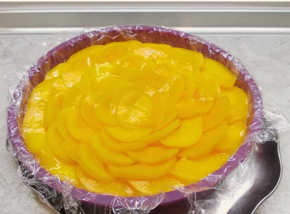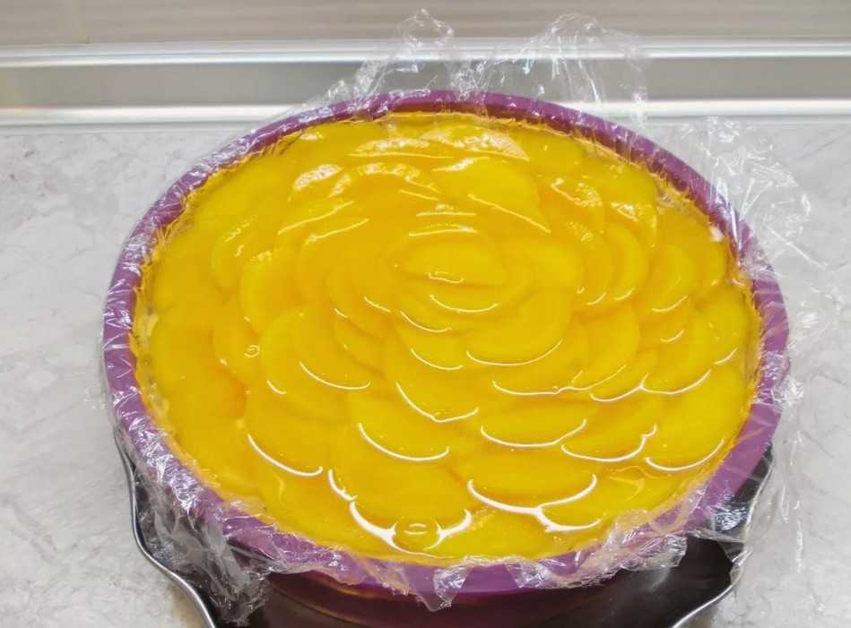 - Заливаем желирующей жидкостью дольки персиков. Чизкейк ставим в холодильник до полного застывания на 3-4 часа (можно на ночь).