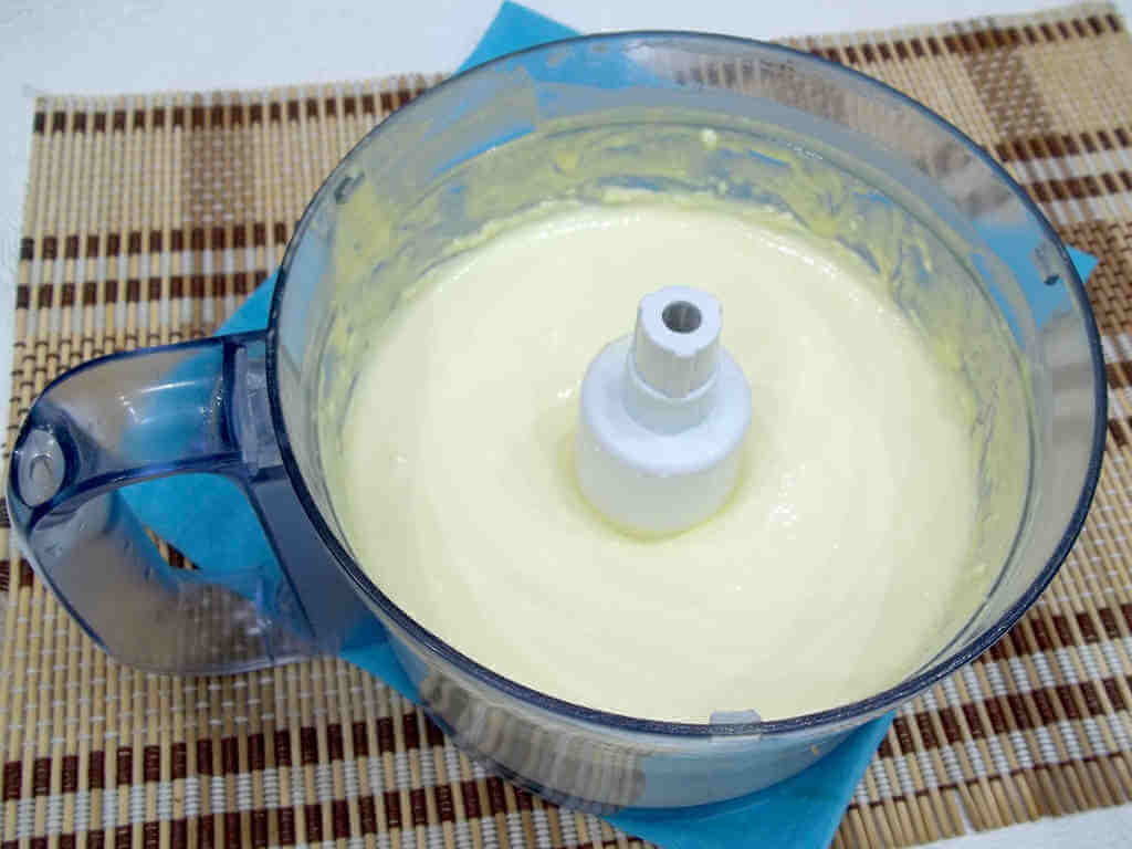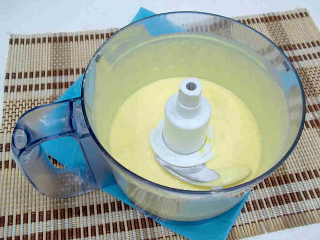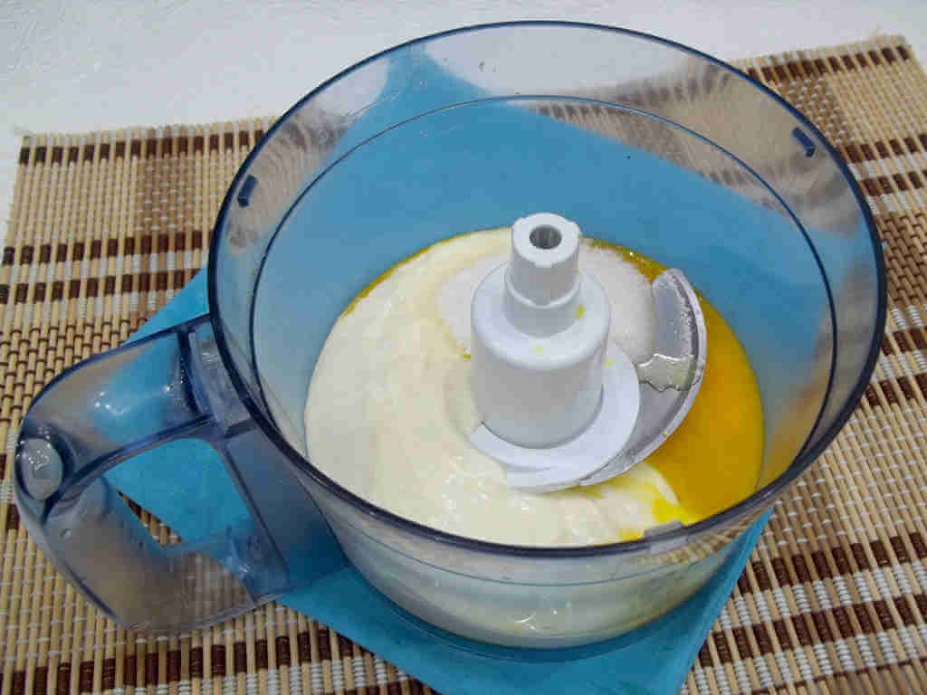 Вымойте кухонный комбайн. Затем налейте в него сметану с яйцами и насыпьте сахар.