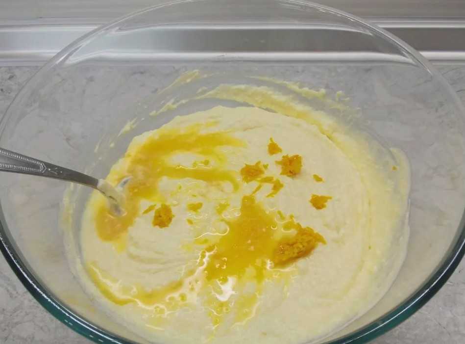 - В творожную массу вливаем апельсиновый сок и добавляем цедру, перемешиваем.