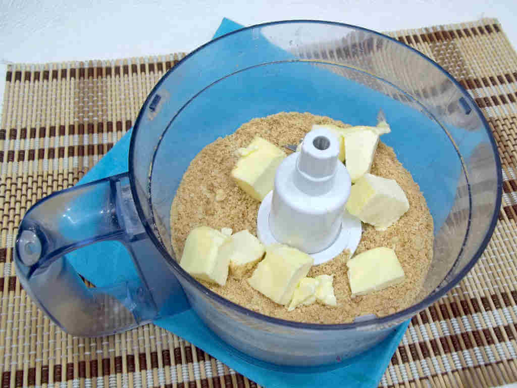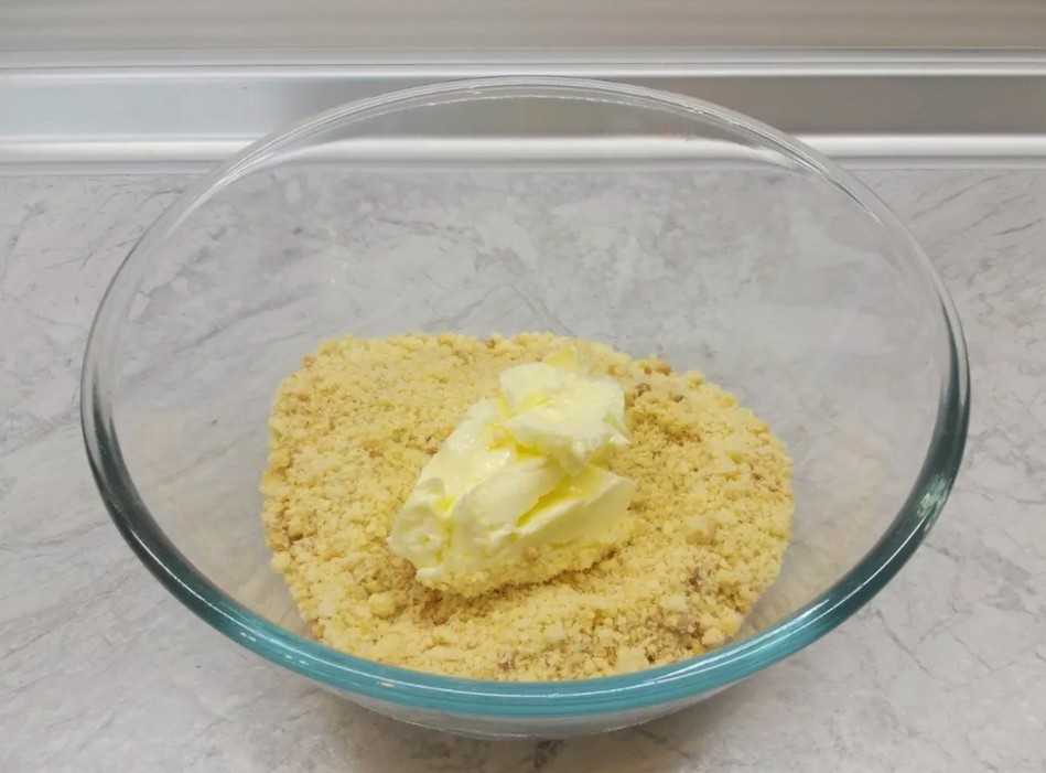 - Печенье измельчаем в крошку, перемешиваем до однородности со сливочным маслом.