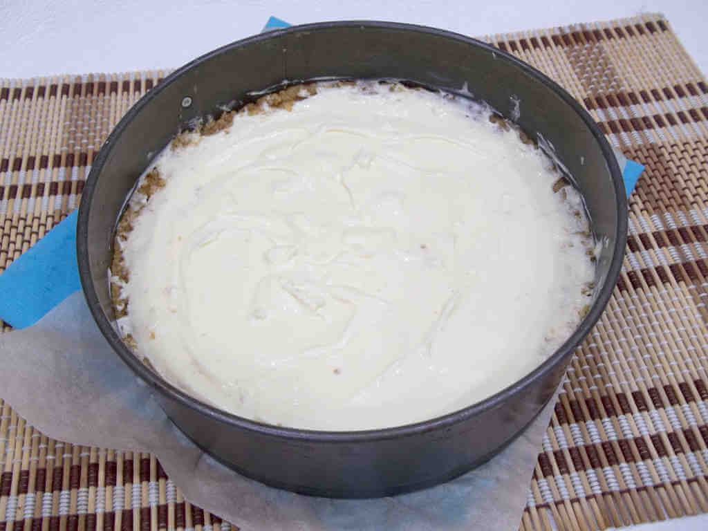 Шаг 5 из 8 Достаньте песочную основу из холодильника, выложите на нее творожную заготовку, разровняйте ее и поставьте форму с чизкейком назад на час для застывания.