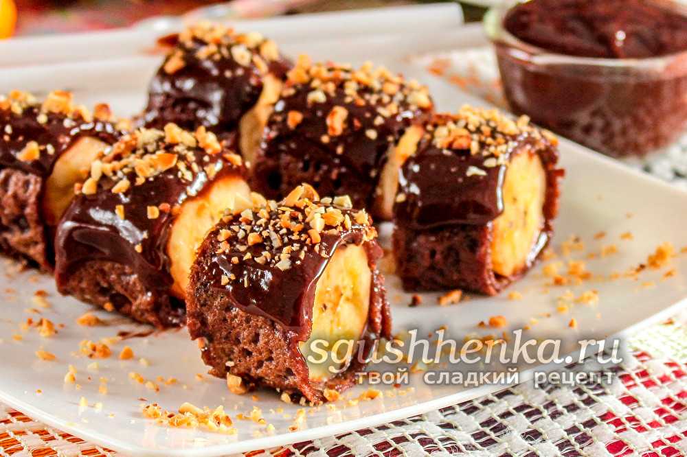 Быстрый вариант вкусного, необычного завтрака – банановые роллы с нутеллой. В том, что он понравится всем, можете не сомневаться – роллы готовятся из тоненьких шоколадных блинчиков, а начинка из вкуснейшей нутеллы и бананов. Да и сама подача очень оригинальная: блинчики смазываем шоколадным кремом, в середину кладем банан, сворачиваем рулетом и сверху тоже смазываем нутеллой. Нарезаем кусочками, посыпаем рублеными орехами и подаем к столу.