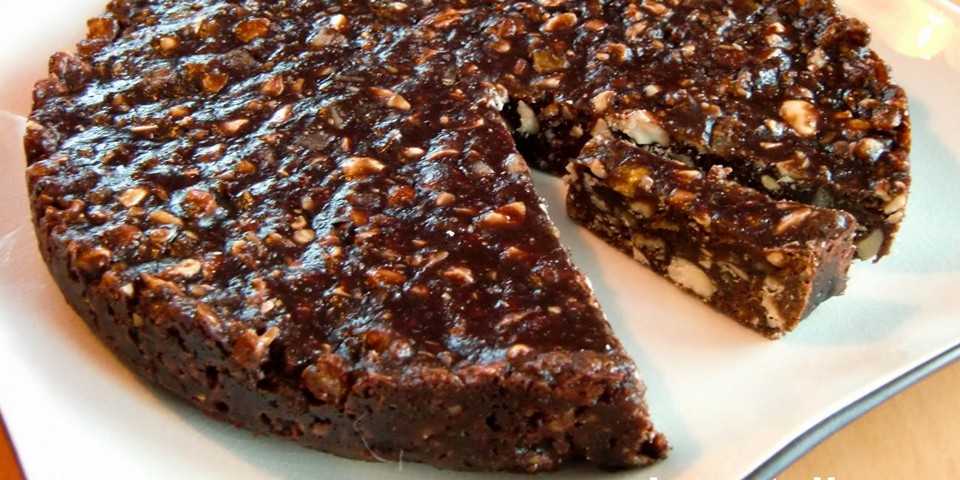 Вылейте получившуюся карамель в силиконовую форму с орехами и сухофруктами. Тщательно все перемешайте и поставьте в духовку, разогретую до ста шестидесяти градусов. Выпекайте сорок минут, пирог должен стать плотным и затвердеть. Достаньте получившийся пирог из силиконовой формы, заверните его в фольгу и поставьте в холодильник на ночь. Готовый пирог украсьте по собственному желанию.