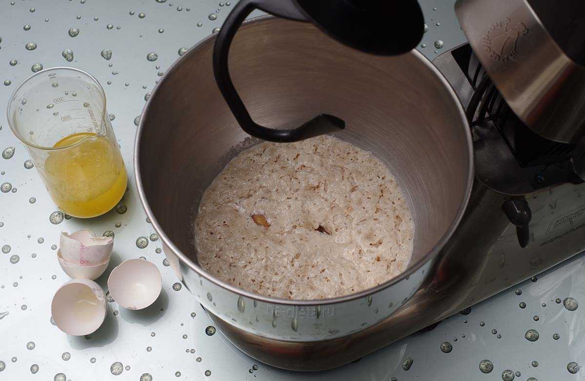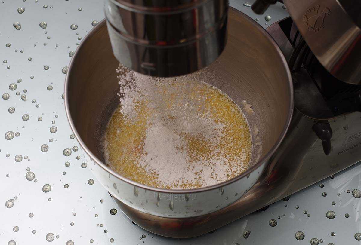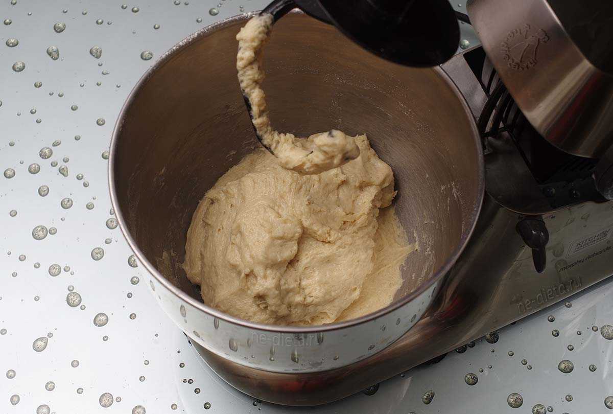 4. В 3 захода всыпать муку, просеянную с солью, и тщательно вымесить тесто руками или в кухонном комбайне с помощью насадки «крюк».