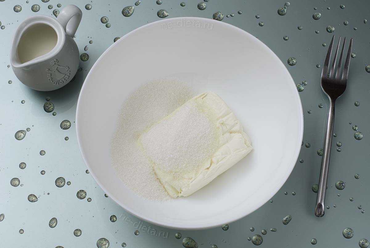 1. Для того чтобы испечь пирог с черникой и сметанной заливкой, сначала займемся приготовлением теста. Для этого в миску выложить творог и сахар, влить молоко и растереть все вилкой в однородную массу.