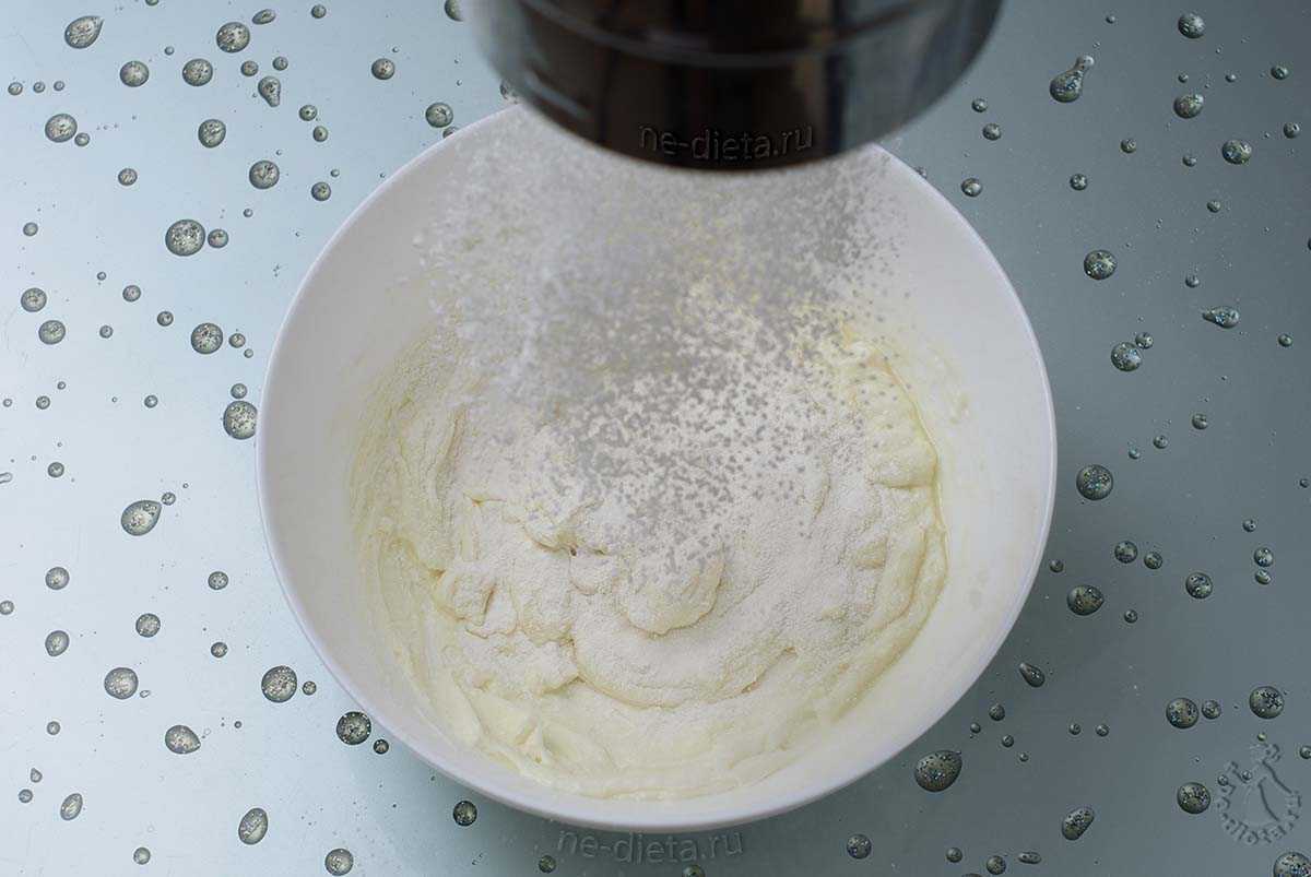 2. Муку просеиваем вместе с разрыхлителем через сито и понемногу вмешиваем в полученную массу.