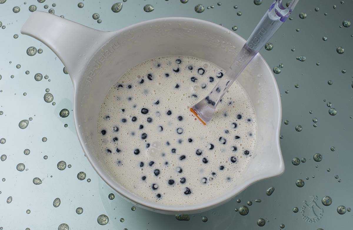 3. Промываем чернику в воде и сушим на полотенце. После того как ягоды высохнут, обвалять их со всех сторон в крахмале и затем добавить в тесто, тщательно перемешать, чтобы все ягоды равномерно по нему распределились.