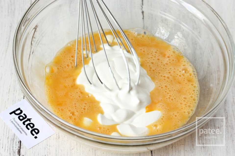 Для теста: взбить яйца, добавить соль, сметану. Взбивать в течение 1-2 минут