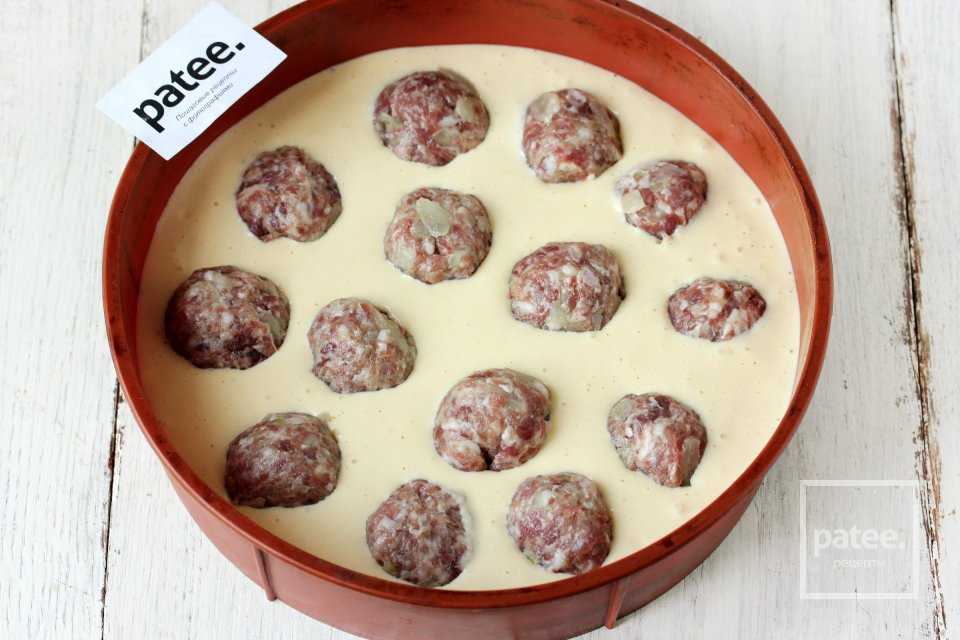 Тесто вылить в форму смазанную маслом (или в силиконовую, ее смазывать не нужно). У меня форма диаметром 25 см. На тесто положить фрикадельки, на достаточно близком расстоянии.