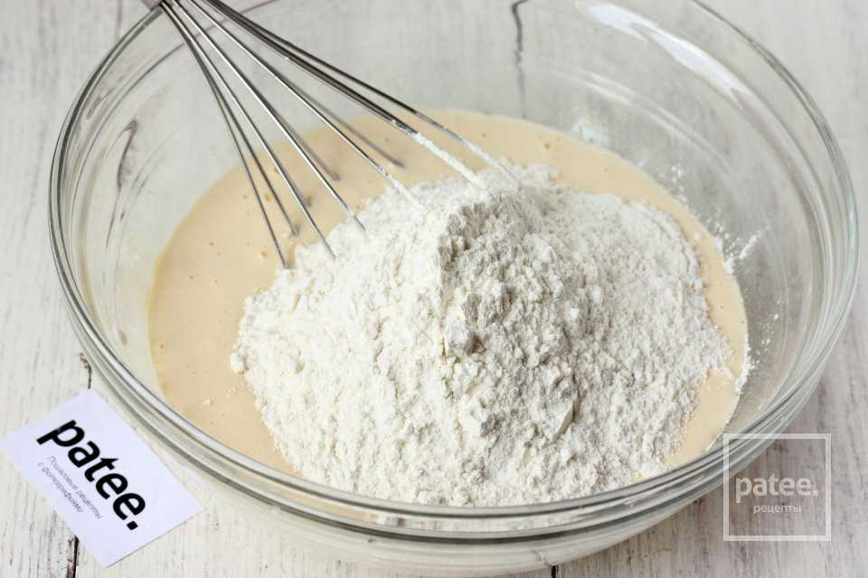 Далее всыпать просеянную через сито муку, разрыхлитель и соль, перемешать.