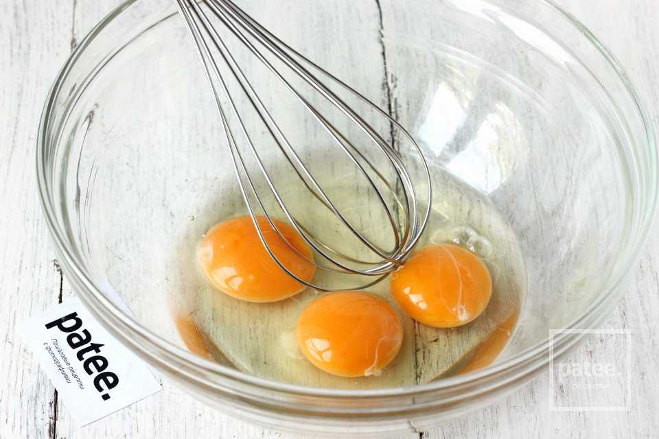 Теперь быстро приготовим тесто для пирога с фрикадельками. В миску разбиваем куриные яйца.