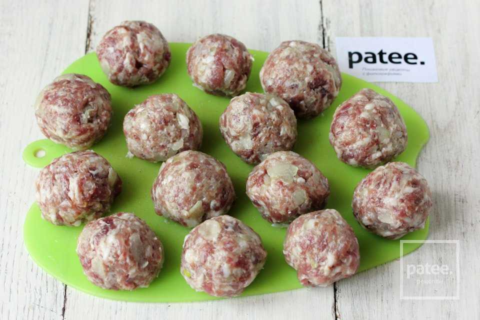 Сначала приготовить фрикадельки (или взять готовые). Мясо прокрутить через мясорубку, посолить, приправить тавами и специями, добавить панировочные сухари и хорошо вымесить. Сформировать фрикадельки размером с грецкий орех.